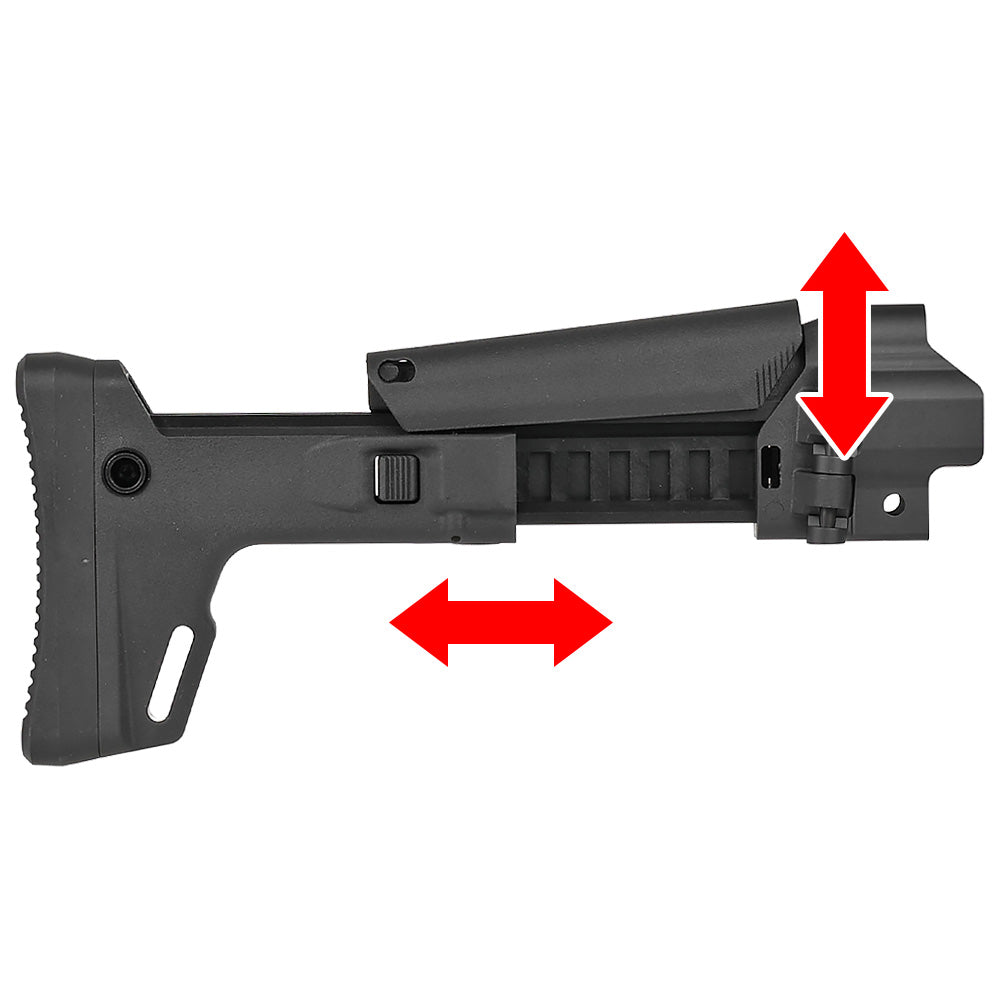 実物ACRストック同様の「7段階の長さ調節」「チークレスト(頬当て)の高さ調整」「折り畳み機能」を備え、体格や装備に合わせて最適なセッティングで使用できます。