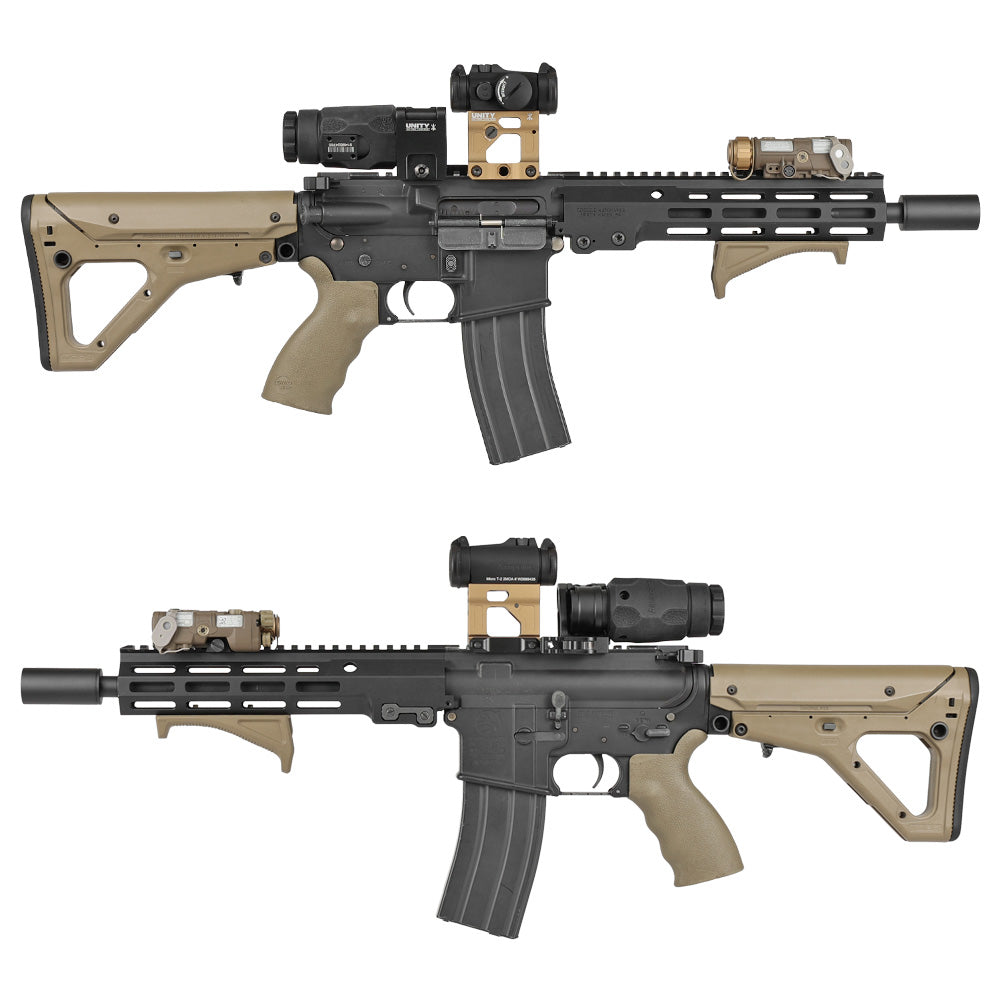 「14mm逆ネジ(メス)」および「11mm正ネジ(オス)」アダプターが付属しており、ハンドガンからアサルトライフル、サブマシンガンまで幅広い機種に取り付けて楽しめます。