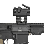 ハイマウント設計により、前方に装着した光学機器との干渉を回避可能。 周辺視界を確保しながら快適にサイティングできます。