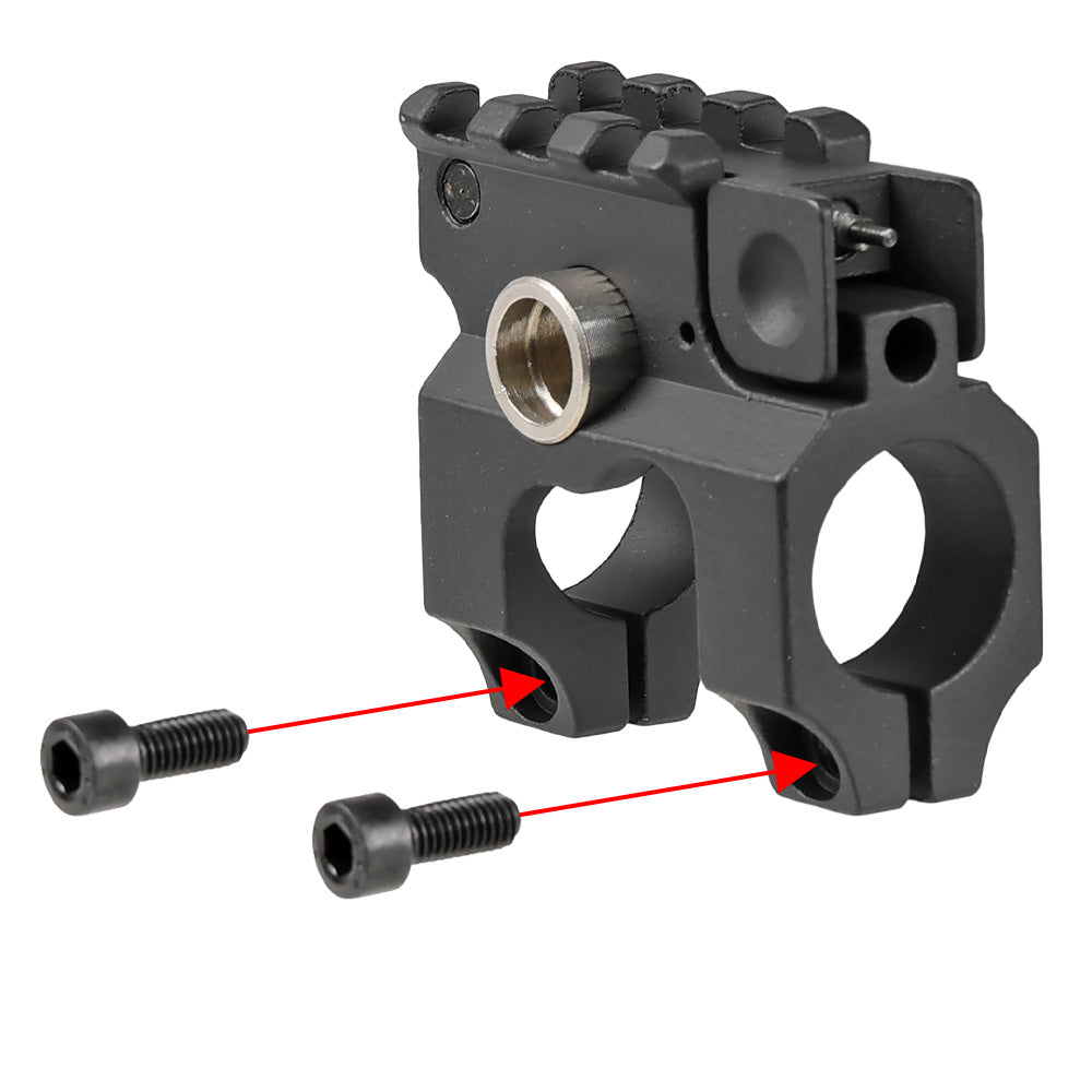 ガスブロックの固定方式は「クランプオン方式」。バレル全体をしっかり締め付けて摩擦力で固定する方式で、ガスブロック用の溝がなくても取り付けられます。