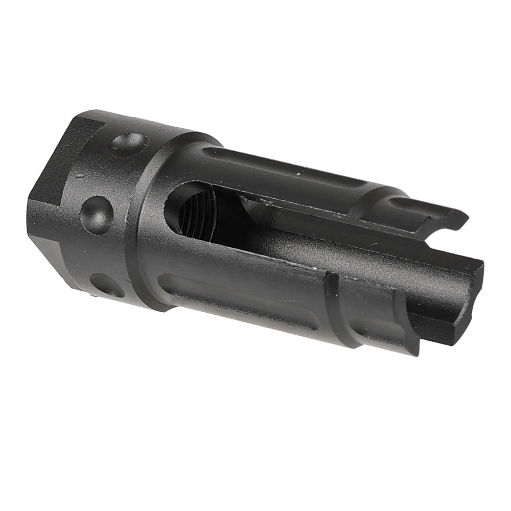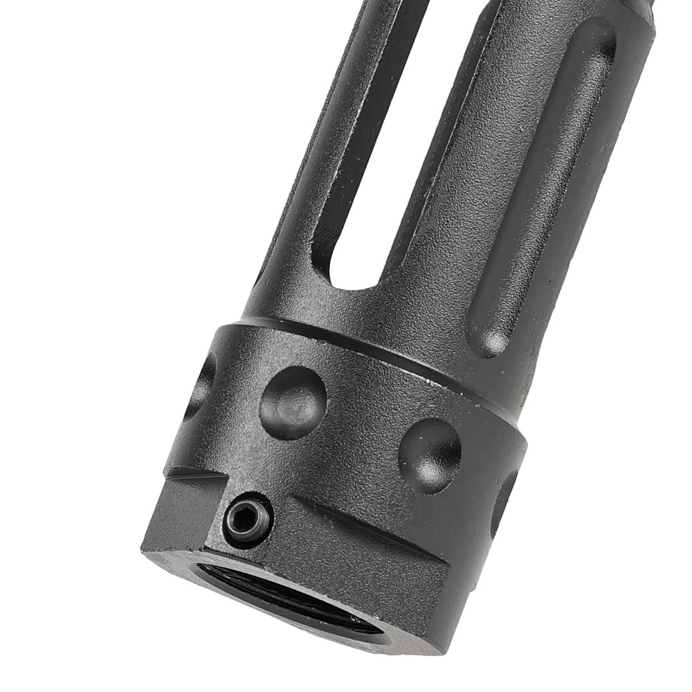 実物では発射時に銃口から出るマズルフラッシュを大幅に抑える効果があり、射手の目がくらむのを防いだり、射撃位置が露呈してしまったりするのを防ぐ役割があります。