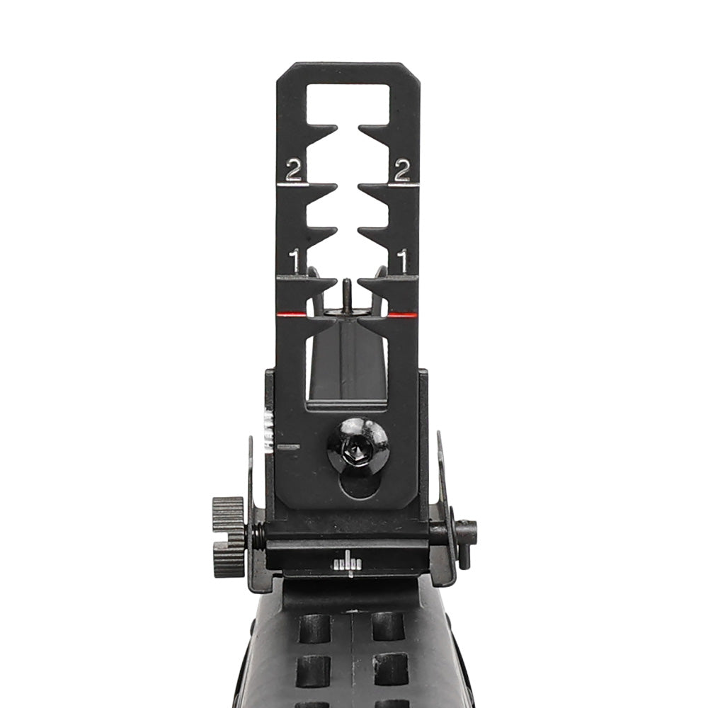 ハンドガード上部にはリーフサイト(フリップアップ)もバッチリ装備されており、山なりの弾道をリーフサイト目安に実際に照準できます。