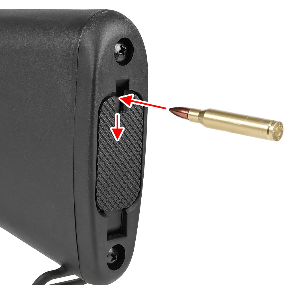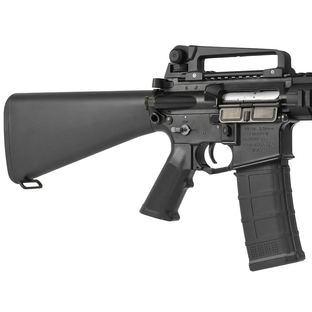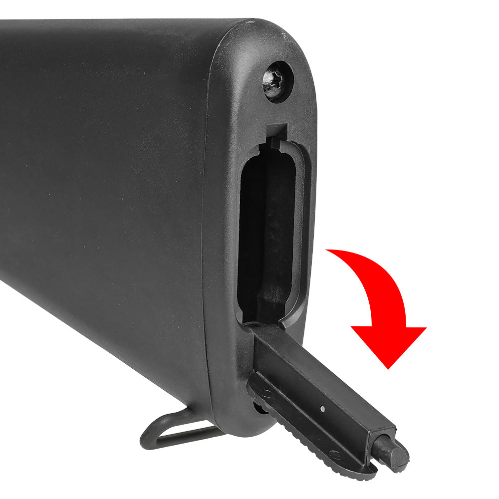 初期型のM16VN(ベトナムタイプ)と比べて外観の差は小さいものの、バットパッド(肩当て部)にハッチが備わっており、ストックを取り外すことなく内部にアクセスできます。