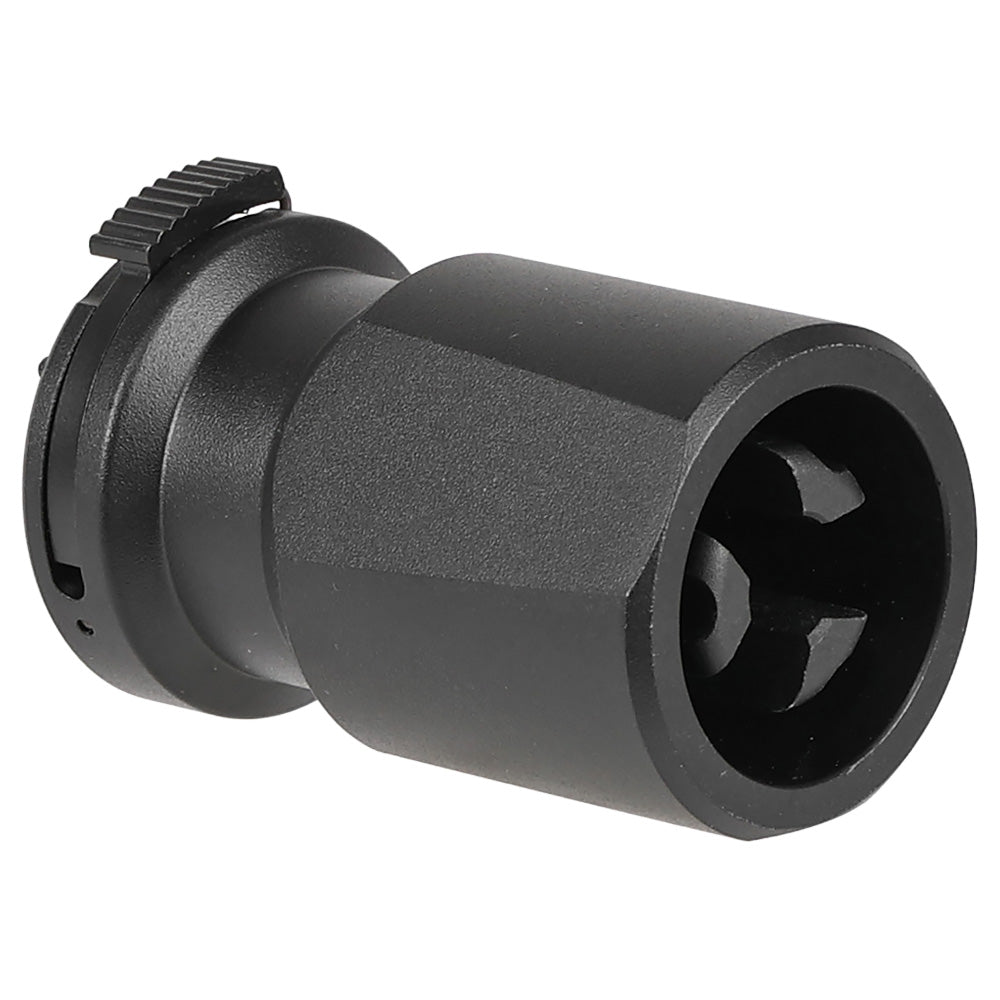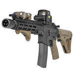 BLASTOUTは「ブラストシールド」「ブラストダイバータ」と呼ばれるパーツで、実物では銃口から発生するマズルブラスト(衝撃波)を前方に逃がすことで、味方や周囲の安全を守ります。特にCQB(近接戦闘)や屋内射撃場など、人が近くにいる状況での射撃では頼れるマズルデバイスです。