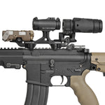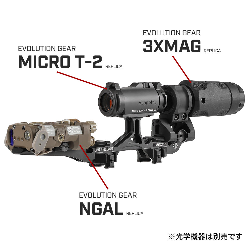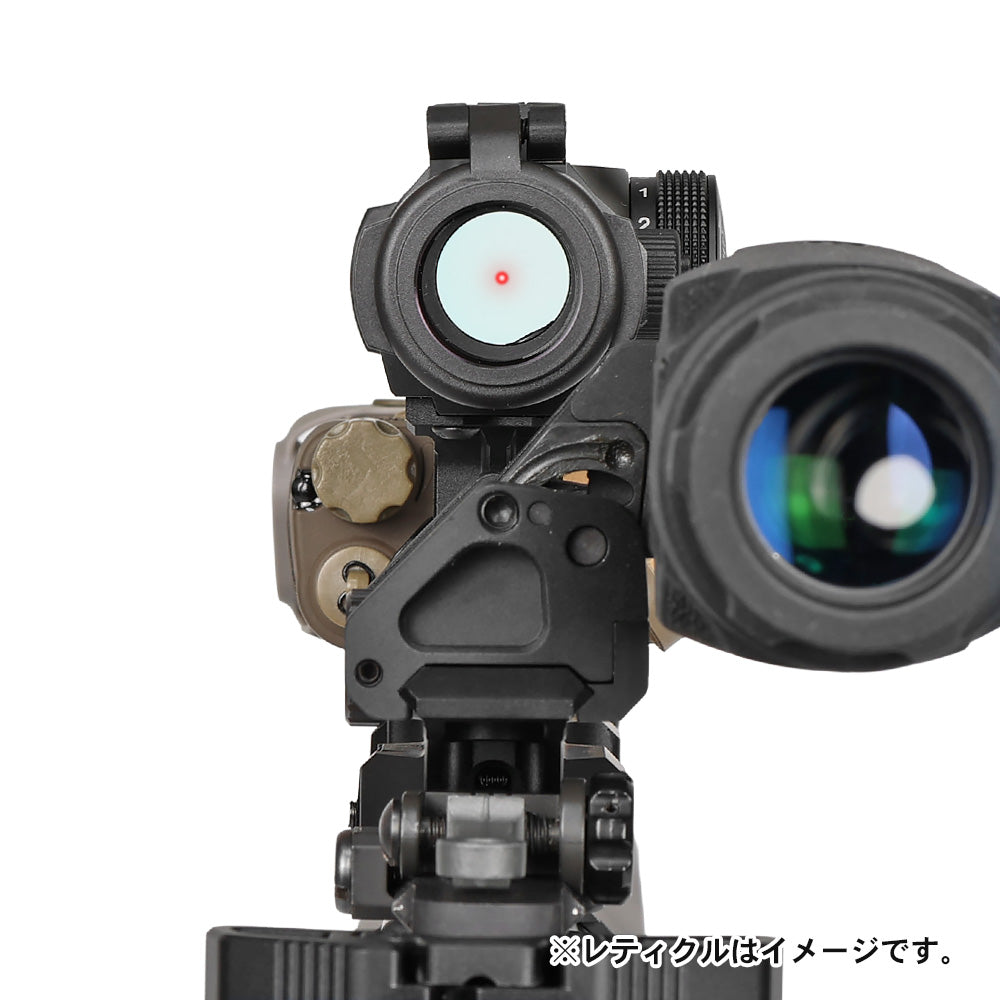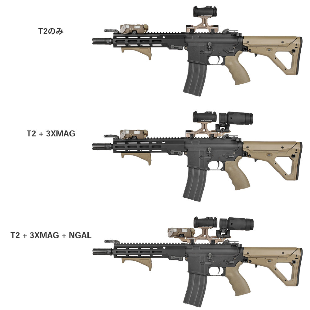 マイクロシリーズ(Micro T1/T2ドットサイト)を「2.5インチ」の高さに引き上げることができる「スーパーハイライズマウント」で、ガスマスクやNVG装備時でも素早く照準できるように設計されています。