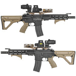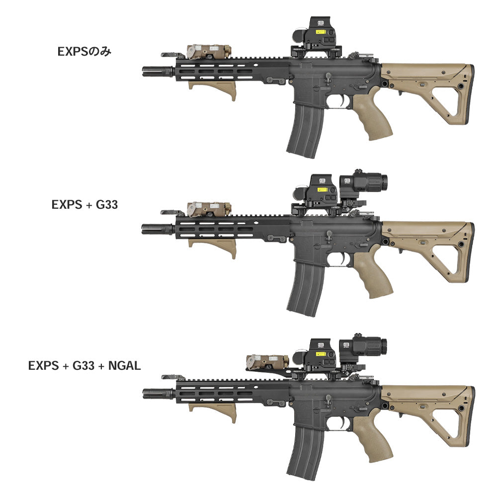 拡張レールを活用すれば、ドットサイト+エイミングデバイス+マグニファイアを一体化して取り付けられます。